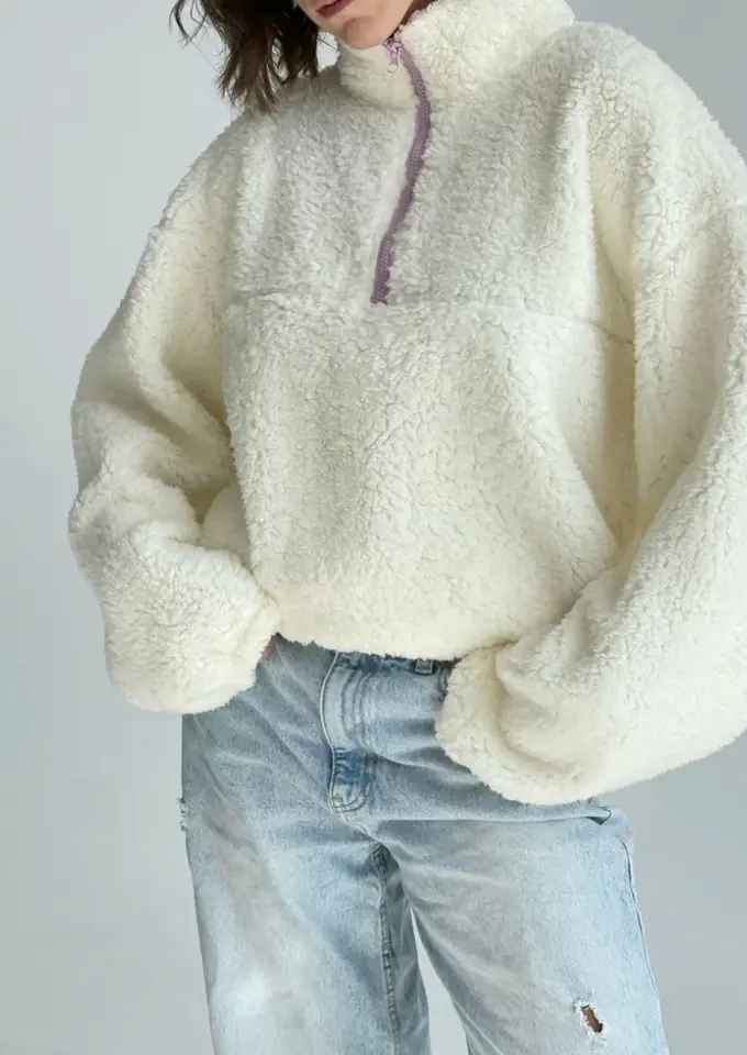 For example, a cream Sherpa with black jeans looks very cool. At the same time, a colored Sherpa with neutral bottoms gives a very playful touch. To create a chic outfit, accessorize with a scarf or beanie and add stylish boots. This look is very good for outdoor walks or meetups.